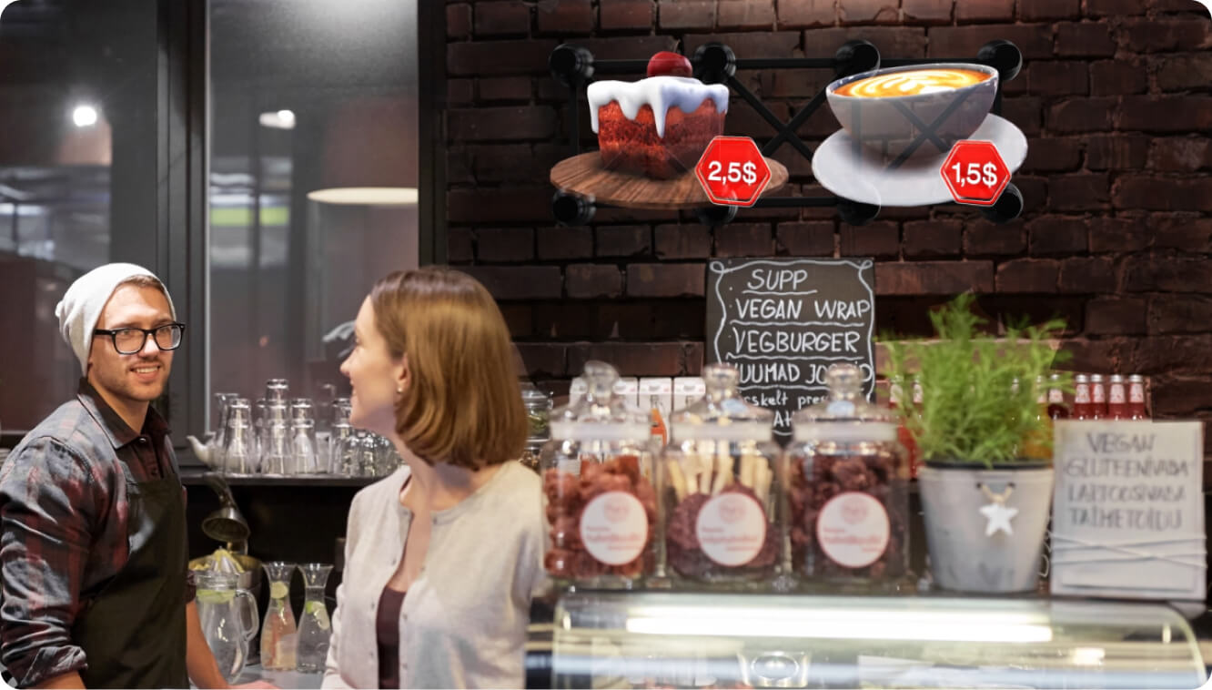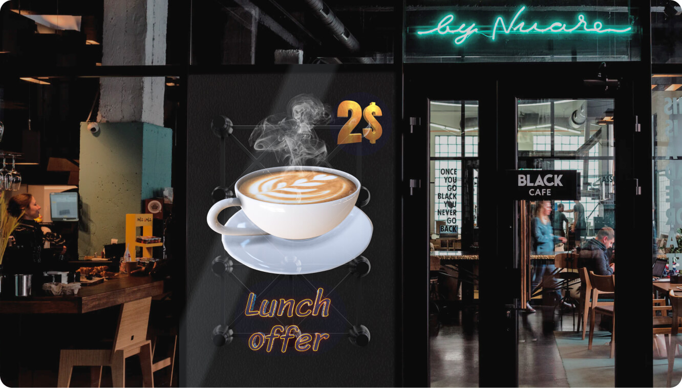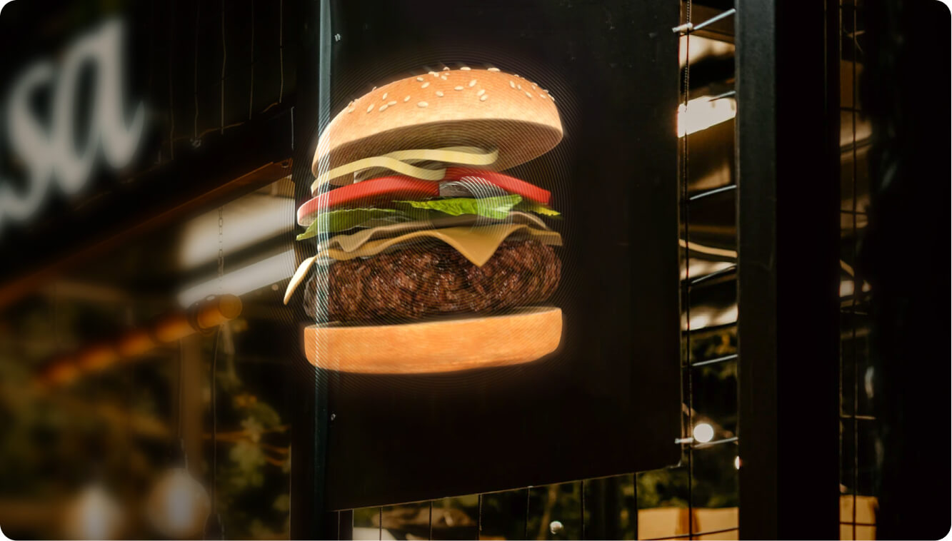 Increase footfall by 30% with a mesmerizing 3D cafe menu display or Holographic outdoor restaurant signs.